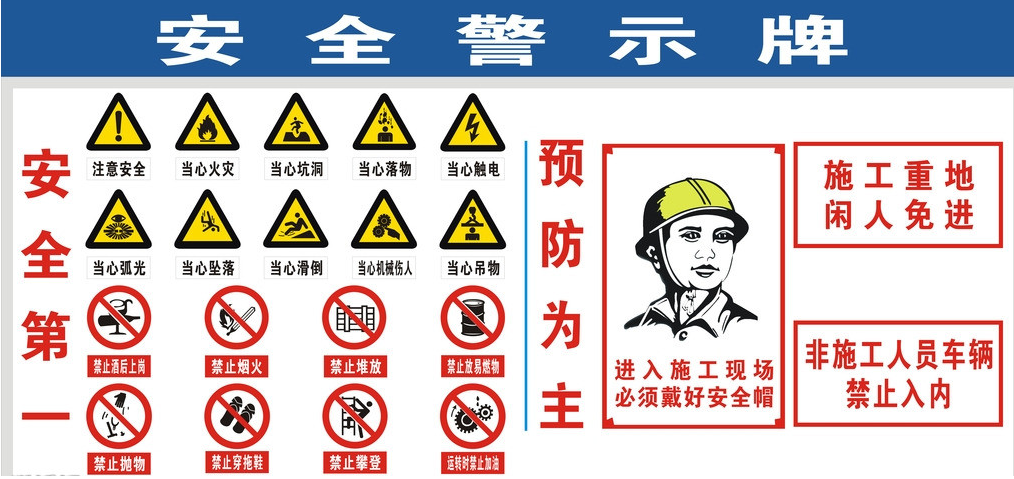 設(shè)備牌:塔吊、電梯、履帶吊或汽車吊等垂直運(yùn)輸、起重設(shè)備,標(biāo)掛驗(yàn)收合格牌、操作規(guī)程牌、機(jī)械性能牌、定人定牌和安全警示牌。